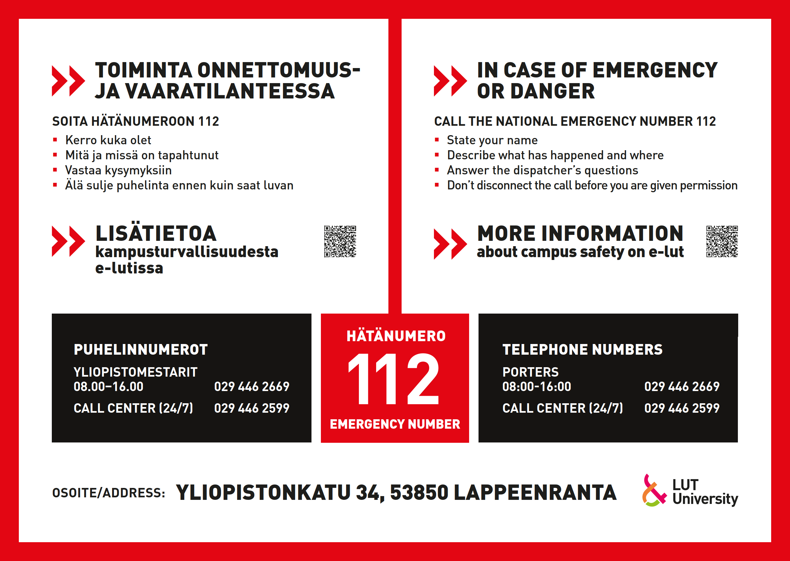 The accident and incident instruction can be found in the lobby rooms of buildings. Security teams responsible for campus safety in both Lahti and Lappeenranta.