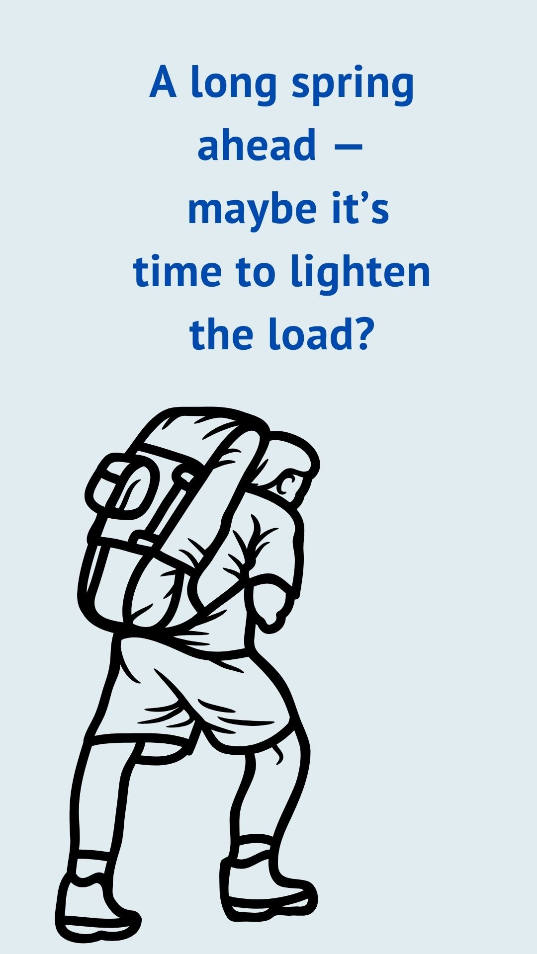 • If you remove all the things that bring joy and help you recover, lighter items are replaced by heavier ones. The load increases, and the backpack straps may break. Make sure your backpack includes things that bring you energy and help you relax.
