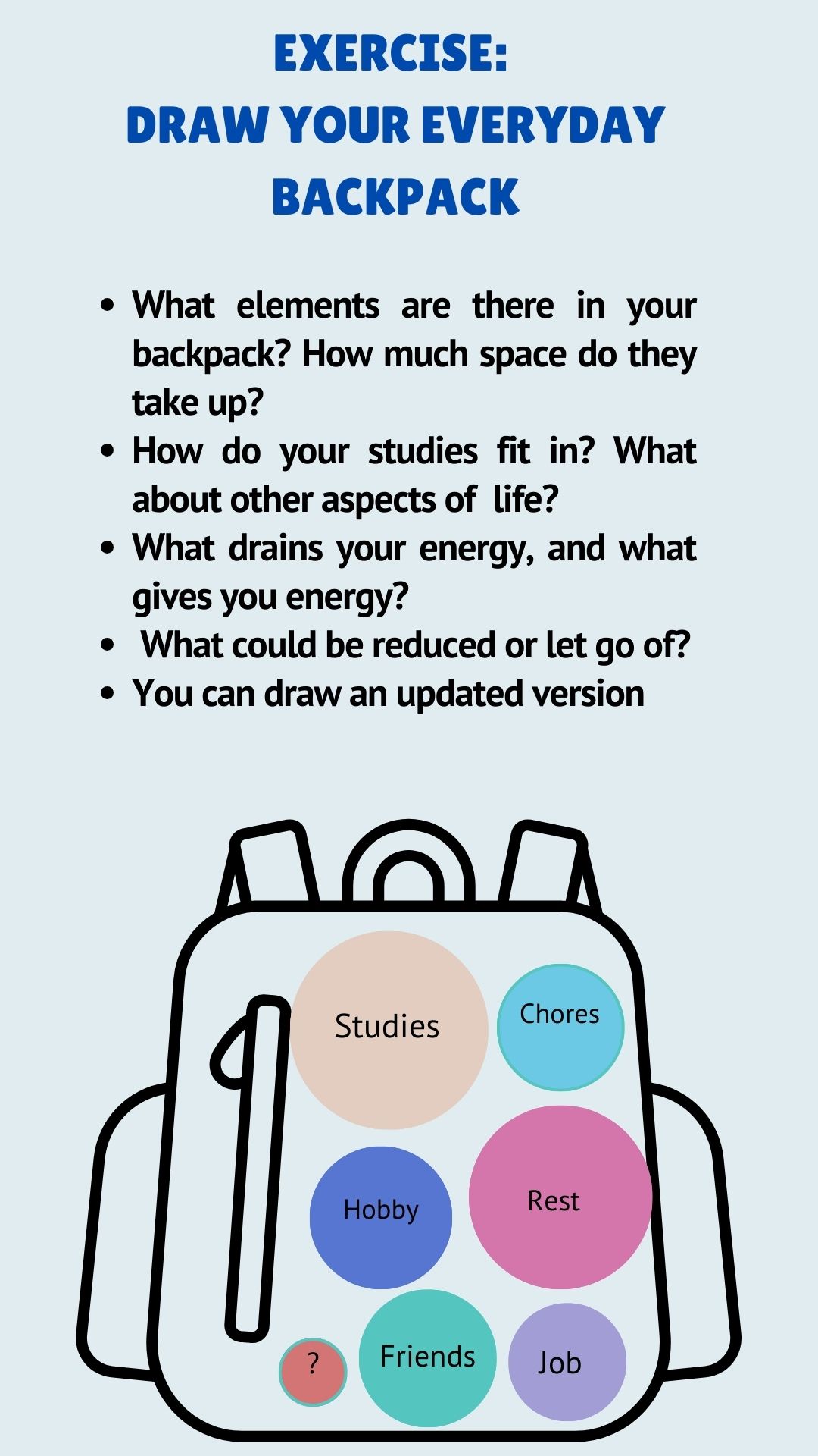 • First, draw a backpack. Begin filling it with different elements of your everyday life, such as studies, work, hobbies, time spent with loved ones, daily chores, and so on.